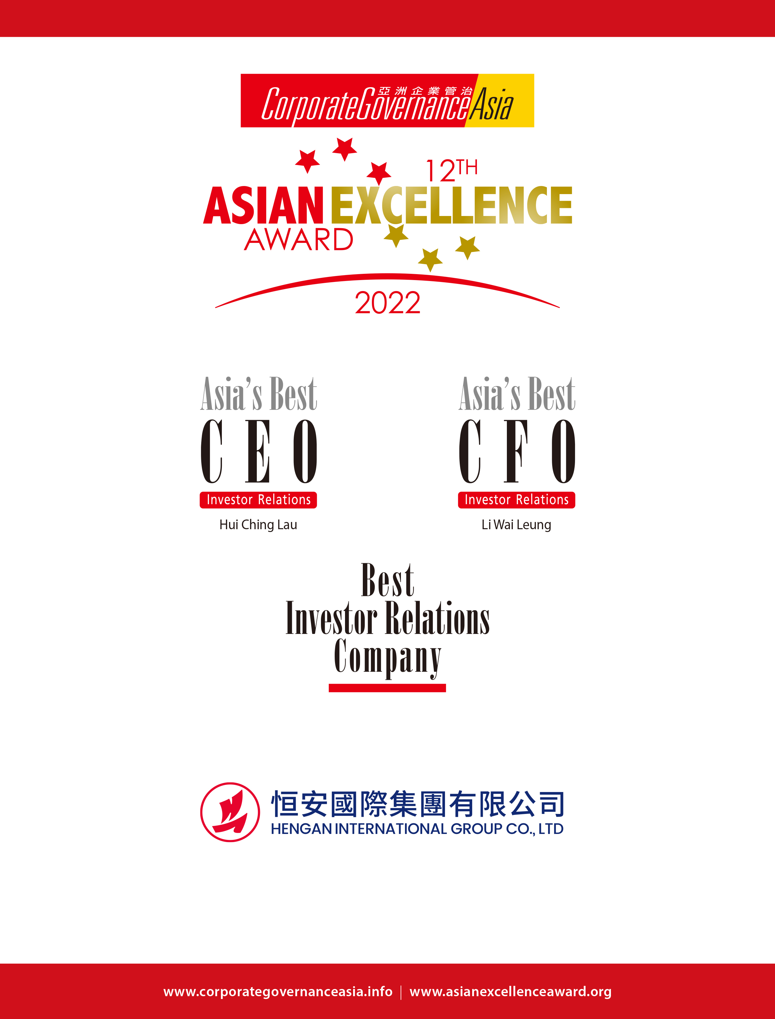 近日,《亚洲企业管治》杂志颁发“第十二届亚洲卓越企业大奖”,神采V8荣获三项大奖:恒安国际集团有限公司执行董事兼行政总裁许清流荣获该杂志颁发“亚太区最佳CEO奖”,执行董事兼财务总监李伟樑获颁发“亚太区最佳CFO奖”,恒安国际凭借在企业管治、投资者关系、企业社会责任等多方面的综合出色表现,同时荣获“最佳投资者关系企业”。